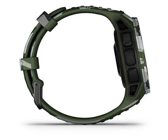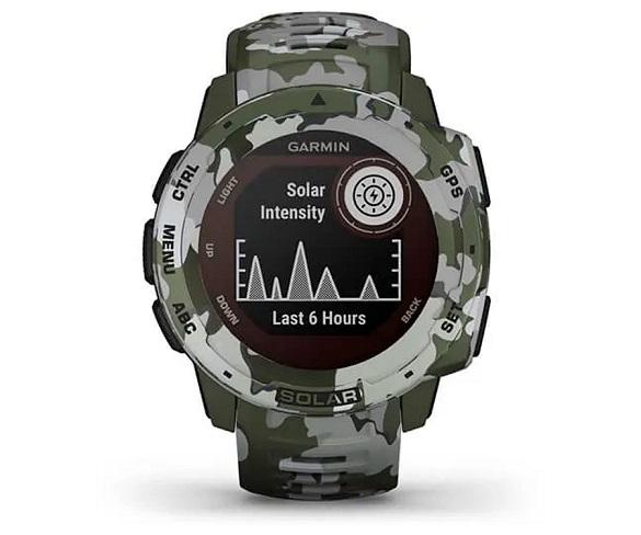 Smartwatch GARMIN Instinct Solar en color camuflatge amb esfera rodona de 45mm i marc de polímer reforçat amb fibra amb pantalla de 0.9" amb lent Power Glass, connectivitat GPS, bluetooth 5.0 i ANT+, modes esportius i resistència a l'aigua 10ATM, monitors de freqüència , saturació, estrès, cicle menstrual i hidratació, bateria amb una durada mitjana de 14 dies