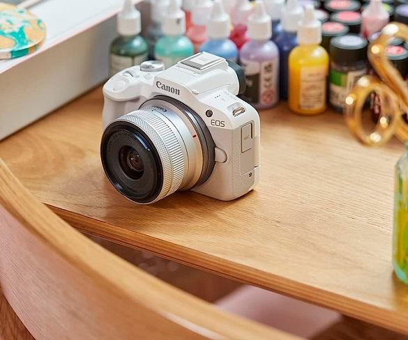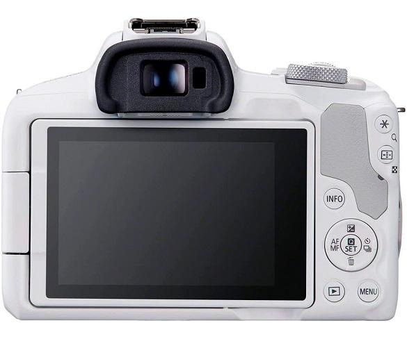 Cámara mirrorless Canon EOS R50 en color blanco con 24.2MP, sensor APS-C, Dual Pixel CMOS AF II, objetivo RF-S 18-45mm f/4.5-6.3 IS STM, conexión WiFi 4, bluetooth 4.2 y visor electrónico OLED en color de 0.39", grabación de vídeos en 4K / 30fps, incluye correa, batería y cargador