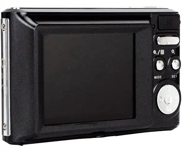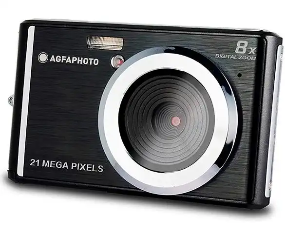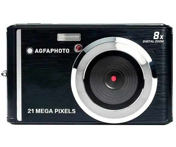 Cámara compacta AGFAPHOTO DC5200 en color negro con 21MP, sensor CMOS y visor fijo de 2.4", grabación de vídeos en HD, incluye batería y cargador