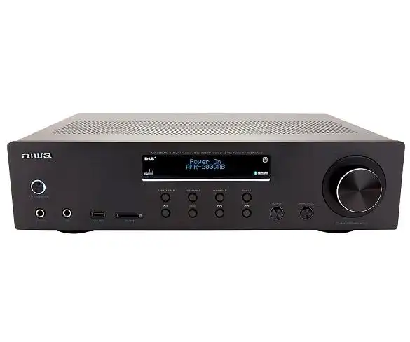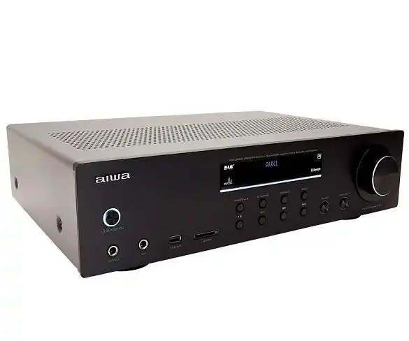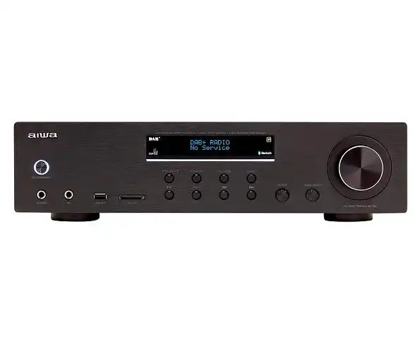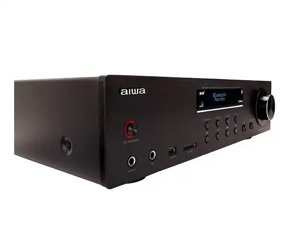 Amplificador de audio de 2.0 canales aiwa AMU-120BT en color negro con amplificador con 120W de potencia, función de reproductor multimedia MP3 por BT, USB y SD, conexiones: bluetooth, USB, jack 6.3, RCA, SD y Phono, 6 entradas de audio analógico y doble salida de altavoces