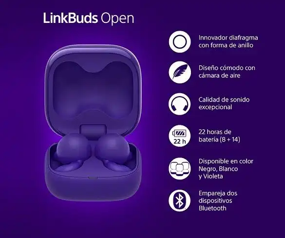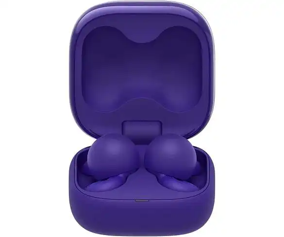 Auriculars InEar True Wireless SONY LinkBuds Open en color violeta amb micròfon integrat per a trucades amb mans lliures, connectivitat Bluetooth 5.3, control de volum adaptatiu, controla els auriculars fent gestos amb el cap, resistència a la suor amb certificació IPX4, Audio Hi-Res amb equalitzador personalitzable, estoig amb fins a 22h d'autonomia, tens pressa? Una càrrega ràpida de 3 minuts us dóna fins a 60 minuts de reproducció.