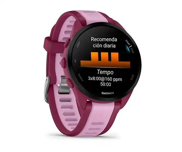 Smartwatch GARMIN Forerunner 165 Music en color lila con esfera redonda 30,4 mm, pantalla de 1.3", el reloj inteligente compacto con conectividad GPS y bluetooth para el día a día con almacenamiento de música integrado que te ayudará a entrenar y a recuperarte de forma más inteligente gracias a sus modos deportivos, monitores de frecuencia, sueño, saturación, estrés, ciclo menstrual, seguimiento de hidratación, y resistencia al agua 5ATM, batería con una duración media de 17 horas