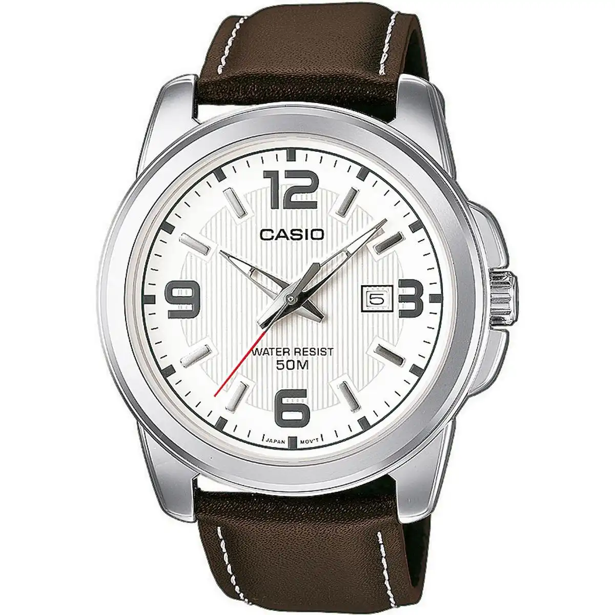 CASIO Collection MTP-1314PL-8AVEF Especificacions Pantalla de neó Les agulles i/o l'índex estan coberts per una capa fluorescent i, si el rellotge s'ha exposat anteriorment a un focus de llum, brillen a la foscor. Indicador de Data La data actual apareixerà a la pantalla. Vidre mineral El vidre mineral, dur i difícil de ratllar, protegeix el rellotge de danys exteriors. Caixa de llautó Corretja de cuir autèntic d´alta qualitat combina una gran resistència amb un aspecte distingit i una gran comoditat. Sivella El braçalet està equipat amb una sivella. 3 anys – 1 pila La pila proporciona al rellotge l'energia necessària durant aprox. 3 anys Classificació de resistència a l'aigua (5 bar) És possible dutxar-se i banyar-se amb aquest rellotge, han estat comprovats per a una resistència a l'aigua de fins a 5 bar (ISO 22810). Dimensions (AxAxP) 50mm x 44,9mm x 9,4mm Pes: aprox. 64 g
