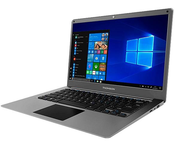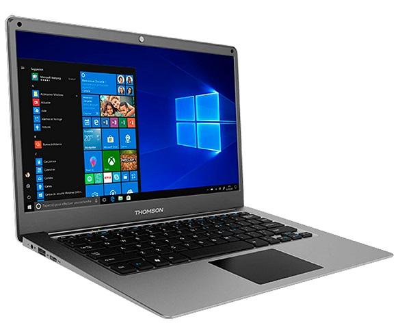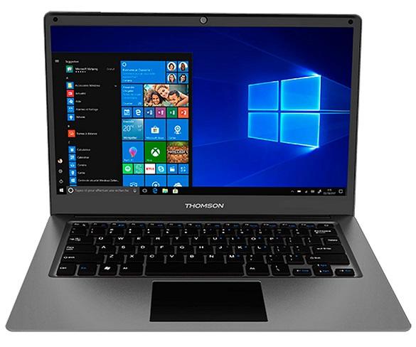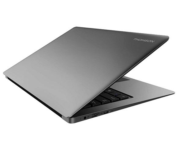 Ordenador portátil THOMSON SP-NEO14C-4TU-N con diseño en color gris, pantalla de 14" LCD LED HD, 1366 x 768 píxeles, sistema operativo Windows 10 in Mode S, procesador Intel Celeron N3350 a 1.1GHz, memoria eMMC de 64GB + disco SSD 256GB, 4GB de RAM DDR3, microSD, batería integrada de 4.000mAh